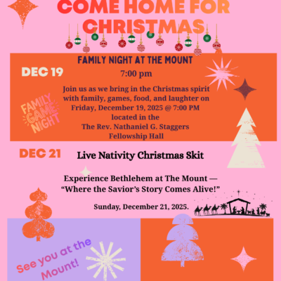 Come Home for Christmas Join us as we bring in the Christmas spirit with family, games, food, and laughter onFriday, December 19, 2025 at: 7:00 PM – Located in the The Rev. Nathaniel G. Staggers Fellowship Hall Live Nativity Christmas Skit! Experience Bethlehem at The Mount — “Where the Savior’s Story Comes Alive!”, Sunday, December […]